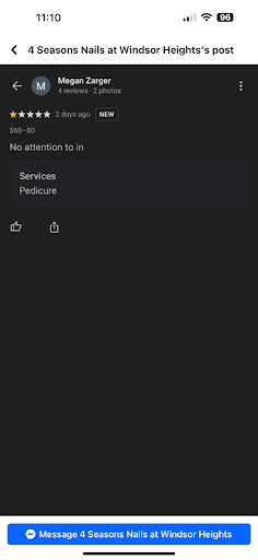 Read moreI went to 4 Seasons one week ago on 3/12 to get an acrylic fill and gel polish before our family vacation. I had seen good reviews and recommendations and the salon I had been going to was booked up and I was unable to get in before our trip so I decided to try this salon out. Upon arriving I was greeted pleasantly and sent back to the sink to wash my hands, I was seated at a manicure station immediately after which was nice. I was never given a name, but the tech started filing the old polish off and prepping for my fill and was a little slower than I’m used to but seemed to be doing an decent job. After getting the fresh acrylic applied, she left and another tech came to take over- while wearing the same gloves he was wearing while working on the client next to me- who he left sitting without explanation. She looked as confused as I. He started filing and buffing my nails down as expected, but perhaps a bit too much as the tips became thin and sharp. After he was about halfway done filing he went back to the girl next to me- in the same gloves- applied her cuticle oil and sent her on her way, coming back to me- again, same gloves. About 10 minutes later (and more filing) he was ready to polish. For some reason he applied polish to two nails at a time then would cure and polish two fingers on the other hand, switching back and forth and then each thumb individually. While I was curing for the 3rd or 4th time he was texting-in the same gloves. The top coat got all around my cuticles so of course burned while curing. Upon completion there was polish on my cuticles and edges of my nails were sharp but I had already been there for over an hour and had another appointment to get to. I left for vacation the following morning (Sunday) and Monday morning I already had one finger with chipped polish. By Thursday, a second finger with chipped polish. I have NEVER had gel polish chip so quickly. I am a licensed cosmetologist in the state of Iowa and am extremely familiar with acrylics, gel polish and both of their processes as well as the state law regarding cleanliness and hygiene between clients. Maybe it was just an off day for the techs, maybe it was just too busy, or maybe I just had bad luck with the techs I had. The photos they’ve posted are absolutely beautiful, but I definitely don’t believe...