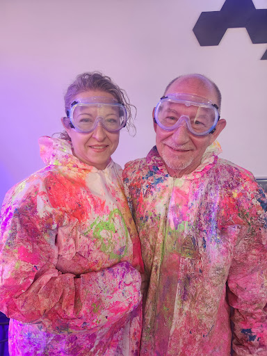 Half way through our session, our lovely Maran came into the room with a surprise. We were given paint guns (not paint ball guns) which could shoot a single splatter of paint, or multiple in rapid succession to make a spray effect. Once we finished our worked of art, we then proceeded to paint each other with the remaining paint in the guns like a couple of 8 year old's who've no control. Afterwards, we removed our doused suits and stepped over to the washing area to remove any paint on our hands and then checked under the black light to make sure we were clean before grabbing our canvases and heading out the door.