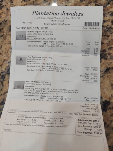 After searching several local jewelers to assess and repair the broken hinge on my eye glass frame it was suggested to me that I go by Plantation Jewelers located in downtown Winter garden. Upon doing so, I was greeted by Anne and she took my damaged glasses to Alex (get this, he's a real master jeweler) who not only carefully assessed the issue with my glasses. But, he took the time to show me exactly where the damage had occurred under a large lighted magnifying glass, he explained the steps involved to repair my glasses, how much time it would take and the costs involved. He even offered me "a risk free warrantee" if the work he provided didn't meet my approval. Talk about "OUTSTANDING" customer service. It surely wasn't absent on this day. As a result, I must say, Alex did an "EXCEPTIONAL" job with repairing my glasses. And, it took him much less time than what he had originally estimated. Am I satisfied with the work that Alex did? You darn skippy I am. His expert craftsmanship saved me $$$.$$ from having to buy new glasses. To Alex, Anne and the staff at Plantation Jewelers, Thank you very guys very much. I hope my GBR brings you...