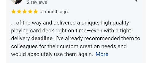 Read moreI have nothing but good things to say about my experience. To provide some context, I am a business owner and work in the gambling space and we were looking for some cool merch ideas to give to our clients. We have some of the generic stuff like hats, pens, koozie, etc. We really wanted that "wow" factor and wanted to have a specialty item and we decided on a deck or cards.