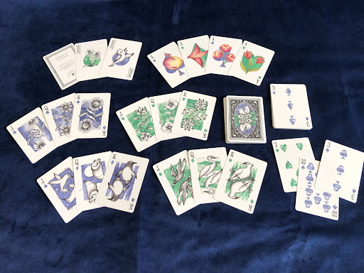 My partner and I are artists (I’m a digital art generalist, and she’s a traditional artist), and we designed our first ever set of custom card decks to give as Christmas gifts to our friends and family. Our design featured watercolor and ink pen artwork that we scanned in and composited together in photoshop. The composited artwork was saved out in RGB color, which is what we sent to Shuffled Ink. The cards we received had color that was well-matched to what we had in our digital composites. Part of our deck’s design also included a custom “colophon” card that isn’t part of a standard 54-card deck, which they were able to accommodate. We ordered a small batch of 15 decks.