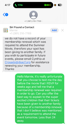 It’s unfortunate that I must post this review, however I do not appreciate the lack of empathy for human beings shown by Marnie today. I RSVP’d weeks ago for the Summer Movie. There was no mention of membership renewal. Today, less than 24 before the movie, I get a text that our tickets have been given away. Not a hey we need you to renew your membership to participate tomorrow. If not, we will have to give you tickets away. It’s just common courtesy. Is that too much to ask or expect? Or how about just being kind?