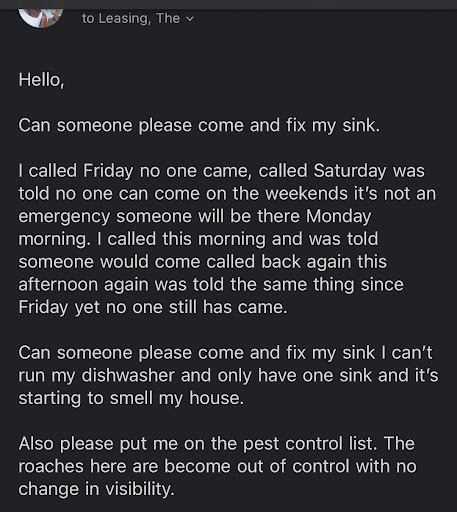 Week 6 By this time, I'm devastated by the state of the infestation. I cried to my fiance about it, completely at a loss as to what to do and so he said he would come to the office with me to talk to the manager. I requested to see the manager and we saw her on her way home for the day even though it was 3:45 on a Monday. She was very disinclined to stay to speak with us but my fiance insisted that there was a real problem that needed discussed. He explained my issue firmly but he was never rude. He never cursed. He never exaggerated the facts or threatened anyone. He is a well-educated college professor and knows how to present the facts. The manager insisted that this encounter was the first she had heard of any issue and promised to "try her best" to contact Orkin but that it was really out of her hands. She also said she would visit the unit with her supervisor the following day. When she did, she left a note detailing the incident from the previous day and wrote that there were no signs of an infestation at all and they would send Orkin the following week. The note logged that they were in the apartment for 10 minutes...of course they didn't see roaches in 10 minutes.
