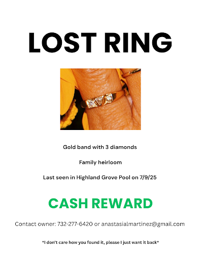 On Wednesday, 7/9/25, I was at the pool from opening to closing. Sometime around 1:45 PM, my family heirloom ring slipped off and was lost in the water.