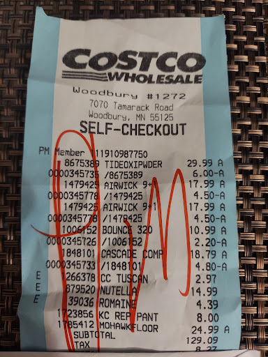 Now, had the Costco attendant been paying attention, she would have seen that I was trying to get the machine to stop beeping at me. She is a short woman with brown hair in an updo. At this point she snidely tells me to scan my card. That's literally what I was trying to do, but okay. I once again reach into my purse and scan my card. I proceed with the rest of my transaction. As I turn to leave, the attendant snaps at me for my receipt. This is odd, because I'm generally asked to provide my receipt before I exit. I give it to her, she marks it off, then once again in a rude tone tells me to keep it out so they can check it again. I give it to the woman at the exit, who frowns and comments that she's surprised it's already been marked off. Oh! Okay! So it WAS weird, and that attendant was being passive aggressive.