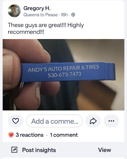 Read moreAndy's Auto and repair I first went to them because, I had a diagnostic test done at O'Reilly's because, my check engine light was on and Lady that did it said I need to get a smoke test maybe had a hole in one of my hoses. and I asked the girl at O'Reilly's where could I go that I'm not going to get ripped off? and she said Andy's across the street so that's where I went. they discovered that my hoses were on backwards so I didn't need the smoke test and they put my houses on right and didn't charge me and the check engine light was off. they advised me to drive the car for about a week and see if the check engine light still stayed off and it did so I went back there and got my smog through them. This last Friday I had to go to Oroville and I had been noticing before that that I was losing coolant so my car overheated I drove it straight to them and they discovered my water pump needed to be replaced they quoted me a price which I didn't quite have that much but they were willing to go down on the price and work with me. They also made sure that I got to work and picked me up from work and my car is as good as new now I really appreciate it. So if you're in need of some car repairs I strongly recommend Andy's Auto Repair...