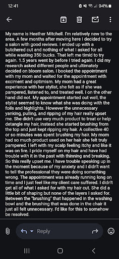 There is a lot to be said about a person/establishment and how they manage conflict and adversity. I would never wish for anyone to get “bad hair“, but if you are unhappy with your services, this is not the establishment to offer conflict resolution. I am disappointed of course, but more so hurt to be honest because I work very hard, and I have very limited spare time. When I inquired about my concerns, I expected my kindness and openness to be reciprocated. I’m new to the area and saw that this salon had great reviews and was recommended by the locals. I booked an appointment for last Saturday and sent an image of my ideal hair goal to the salon for preparation. When I got there, I collaborated with my hairstylist, and she recommended getting a gloss to which I agreed with as long as it would get me closer to my hair goal. I told her I knew nothing about hair products/processing so I trusted her judgment. When the appointment was finished, I inquired about the color because it was not what I had hoped for. She told me that I needed to book a balayage. OK, fine. Not the first time that I had been disappointed with my hair, but I didn’t hate it, it just wasn’t what I asked for. The next day, I looked more thoroughly through my hair, and it looked like I hadn’t even had a service the day before. I messaged the salon with my concerns to which they replied that they would respond to me the following day. I heard nothing. I inquired again, and did not hear anything again, so I stopped in the salon myself. Upon my arrival, the staff turned their backs and refused to make eye contact with me, so it was obvious that the matter was discussed, however, I was still not contacted. I made it clear that I did not want to ruffle any feathers, I just wanted to understand what was done to my hair and why I still had so many grays visible and to see if I could get the issue corrected. I was not asking for free services, I just did not understand how I got my hair colored and still left with gray hair. I went with an open mind because I’m genuinely flexible, more than reasonable and overly understanding… But I also value accountability. Mistakes enable us to learn and ultimately achieve success. However, their resolution was to give me what I initially asked for at full price... why wasn’t that done in the first place? It is difficult for any person to visualize what a client wants specifically, but the way that I was avoided, was just completely unprofessional. Again, overall hurt over the customer service I received. I would rather give my business to a place that genuinely cares to address concerns rather than hope they just “go away”. I did not go in there hot headed or anything of the sort. I paid over $100 plus my 20% tip to be disrespected and brushed aside. I’m sure there’s some great talent in there, but again, true character presents itself when things are less than ideal. I’d never want to make anyone feel as though they are sub-par at their passion. I just wanted to be addressed appropriately. Unfortunately, this is not the place I...