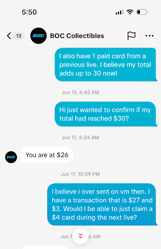 Read moreBought off their tt live and had oversent $. Couldnât find anything else I wanted so didnât mind the difference and asked for my cards to be sent anyways. I guess my cards werenât found and I wouldâve just appreciated some communication instead of being left on read constantly. If refunds arenât an option then just let me know and I wouldâve accepted that. Making me rage like my pfp smh.