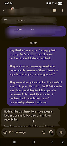 Hour and a half later I get called saying my puppy is too aggressive, all they accomplished was the bath and I needed to come get him. I was shocked and immediately went to go get him. On the way I reached out to his usual groomer to see if something wasn't being told, even though my 13yr old cousin has had bathed him without issue before. I show up and he just retells me my puppy is too aggressive. I point blank said, "you sure he wasn't playful and you took it as aggressive because he is a German shepherd??" NO ANSWER. When he comes to bring my puppy to me he is legit holding the slip lead so high and tight my puppy's paws were barely touching the ground. As soon as I got to him I took off the slip lead and put on his harness and leash without issue.