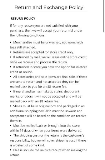 Read moreI purchased a sweater at the store for my daughter’s birthday and asked about the return policy. I understand it is a store credit only but when my daughter took it back, she said the store credit had to be used the same day as the return. That was not communicated and when looking at your policy, the same day requirement is not mentioned in the return policy. Please escalate to store owner as this is not a good way to...