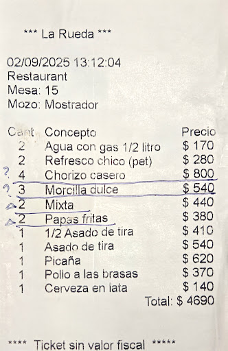 그 후 다른 식당에 가보니, 상기 계산서는 사기인 것 같다. 이 리뷰를 주인이 본다면, chorizo, morcilla, ensalada, papa frita 1인분 사진을 여기 올려주기 바란다.