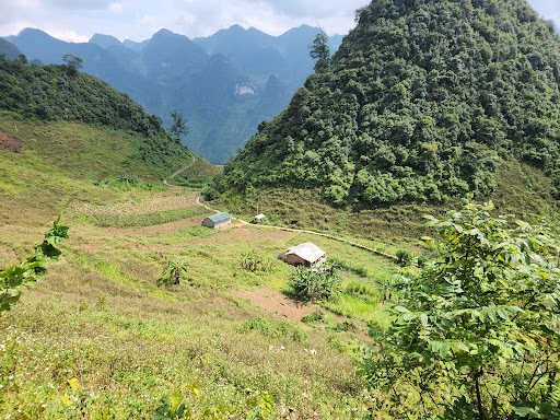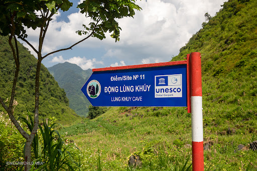 This is an interesting cave site, a few km off QL4C Road. However, for anyone who’s interested in coming here be warned, there’s a fairly tough hike to get up to the cave entrance. If you’re traveling from Ha Giang, the access road is on the left (off QL4C) and just past a Petrolimex gasoline station. The access road is one of those cement laneways and it takes you through some very scenic terrain, to the parking area for your motorbikes. Note: the distance from QL4C road to the parking area is around 4 km. From the parking area there’s a 1.2 km hike through a majestic landscape, to the cave entrance. The final section of the hike is up a long flight of steps which will certainly have you perspiring and breathing hard, by the time you get to the ticket office. Note: if you come here on a warm afternoon, take plenty of drinking water. The entry fee for the cave is 30,000 VND.