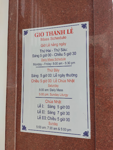 Giờ lễ CN , 5h + 7h30 + 17h . Thứ 7 lễ thế CN lúc 17h . Thường , 5h + 17h30 .