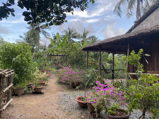 Mê nhất là đi dạo khi nắng đã dịu lại. Từ đầu đến cuối làng có một con đường nhỏ, hoặc là dừa che, hoặc là cây hoa, hoặc là cỏ may. Bạn đi dạo và có thể ngoặt vào nhà ai đó, như nhà cô Vân, anh chị Thảo Thành, chú Tư Pha, dừa nước Năm Liên. Chị Liên hiền ơi là hiền.. Bạn hãy thử im lặng và hít thở hương thơm trong trẻo của bình an và tĩnh tại.