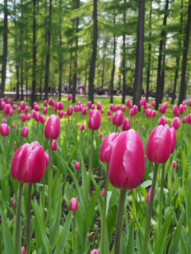 Парк засажен хвойными и лиственными деревьями. От хвои просто изумительный аромат. Мамочки с колясками и детками постарше останавливаются в хвойной посадке, чтобы насладится запахом.