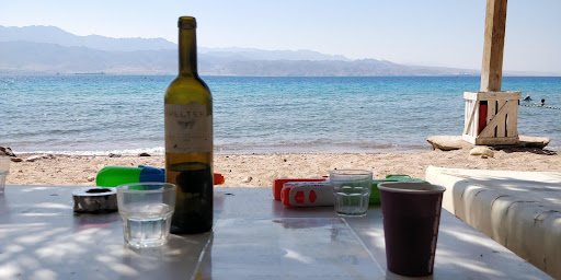 The views, however, are lovely with Israel to the right and Egypt to the left across the bay. The ground is very hard, there’s some dry dirt-like sand mixed with sunflower peels, plastic bottle caps, cigarette butts, and chicken bones. The water is relatively clean, however, often with all and sundry garbage either floating or sunk: plastic bags, bottles, pizza boxes, discarded underwear, etc.