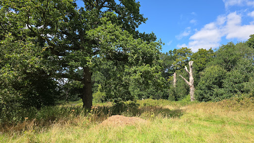 Short forest walk with free car park. Quite muddy at the moment with all the recent rain, not lit at all so not a good place to walk at night, but still a good 10/15 minute quick circuit. Small playground near car park, and small lake also. Plenty of bins and lots of squirrels for dogs to chase.