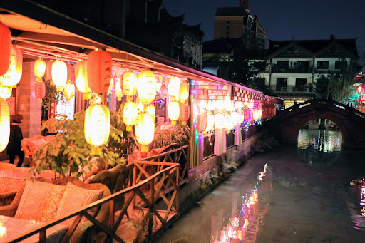 虽小但依旧古色古香,商铺和各类小吃的摊位琳琅满目。