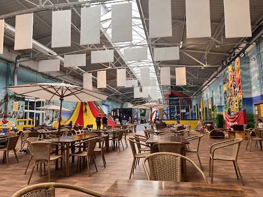 Ganz nett für Kinder bis Max. 12 Jahre. Die Preise sind ordentlich, aber für junge Kinder ist doch immer was zu finden. Sehr schön sind die rutschen das Fußballfeld oder die Trampoline. Der Bereich für ganz kleine Kinder ist in Ordnung. Hier findet man Lego, Duplo und größere andere Bausteine Air Hockey und eine Art Gokart für Kinder kostet für einige Minuten extra Bezug auflegen kann gesagt werden, dass es die üblichen Fastfood Gerichte gibt. So wie Slush Eis normales Eis und Getränke aus 0,5 l Flasche. Das Eis ist preislich von 2,50 €-5,00€. 0,5 l Soft Getränk kosten 3,50 €.