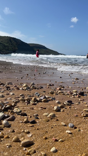 As beaches go, this was one of the prettiest ones.I have seen here. The day that we were there.The wind was so violent that there was red flags flying.However a lot of people were in the ocean they do have lifeguards watching over which obviously ignored the red flags. The sand is a deep caramel color it looks like crushed up biscuff cookies!!! The wonderful thing is that it has facilities bathrooms and showers and a small restaurant which we did not try. There is a company of men that put up lounge chairs and umbrellas add a cost. Write outside of the beach.We also found a very\nIndustrious man that obviously used his land for a parking for a fee of two euros. There are also several outlets with bathing suits and floaties and things like that if you forgot yours. The road to get there was a little bit harrowing for those of us that don't drive On the left hand of the road because the streets are very narrow and they are two way streets!!! Put all in all a very nice experience. HowEver there are a lot of rocks in the sand so it's hard to figure out where to put your towel if you decide not to get one of the deck chairs!
