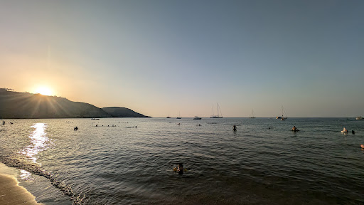 The beach is sandy but to enter the sea there's like a layer of stones/pebbles to negotiate... Best just jumping in and swimming as soon as it is deep enough.