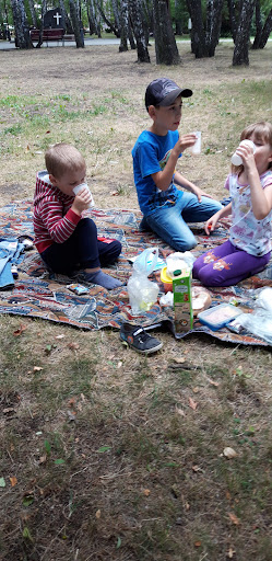 Со стороны храма расположена большая детская площадка и зона для уличных тренировок (площадка для воркаута).