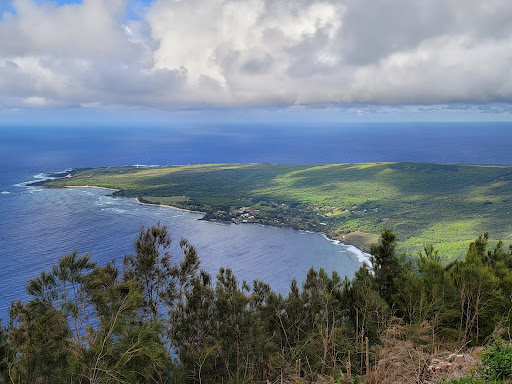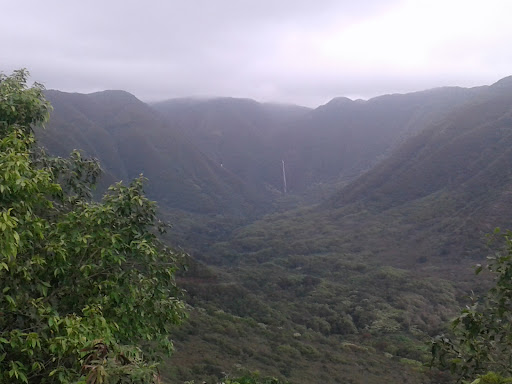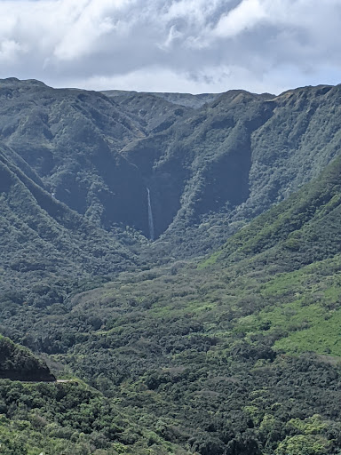 The scariest narrow 1 1/2 lane mountain road on the east side of Molokai. The vegetation changed dramatically from higher to lower elevation and felt a bit like Jurasic Park. About half way to the end of the road there is Puu O Hoku Ranch, a small gift shop with minimal snacks or provisions. The road to turns very steep and several switch backs to reach the end. There are a couple places to pause and look over the edge but they are mostly over grown and you can't see much. At the end of hwy 450 you will have a rustic parking lot with a nice picnic table looking into Halawa bay. The river runs into the ocean here and you can take a few steps thru the river onto the sand island in the bay. If you want to go to the waterfall you need to be on a guided tour as much of the land is privately owned.