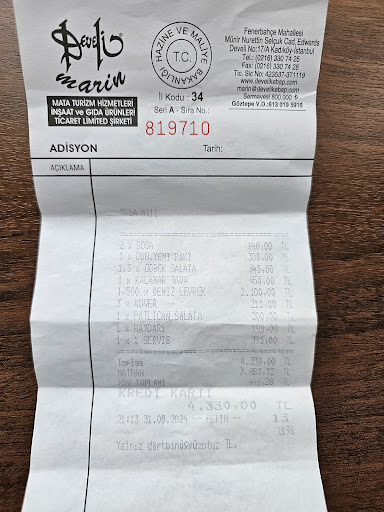 Read moreDeveli 1912 Restorantını 2 hafta önce tercih edip memnun kalmıştık. Aynı şeyi bu yer için söyleyemeyeceğim. Önden meze salata ve kalamar söyledik, bunları bitirdikten sonra balıklar gelsin istedik. Mezelerden tam 45 dakika sonra getirdiler balıkları. Ne zaman gelir soruma da pişince getiricem dedi garson arkadaş. Havuz levreği 550 tl idi ve 3 tane söyledik. Gelen balık 1 balık asla değildi. Her birimize yarım porsiyon geldi. Neyse tamam dedik. Hesabı görünce şok olduk 2100 tl alınmış sadece 3 levreğe üstelik 3 tane değil 1.5 tane balık geldi. Fişe bakınca deniz levreği yazdıklarını gördüm. Çok da uzatmadan ödeyip çıktık. Balıkların lezzeti iyidi haklarını yemeyelim. Ama gerçekten hem hizmet kötüydü hem de yanlış balık yedirdiler. Onun haricinde mezeler salata falan hem güzeldi hem fiyatı uygundu. Bi daha asla gitmemm. Not: Fişi...