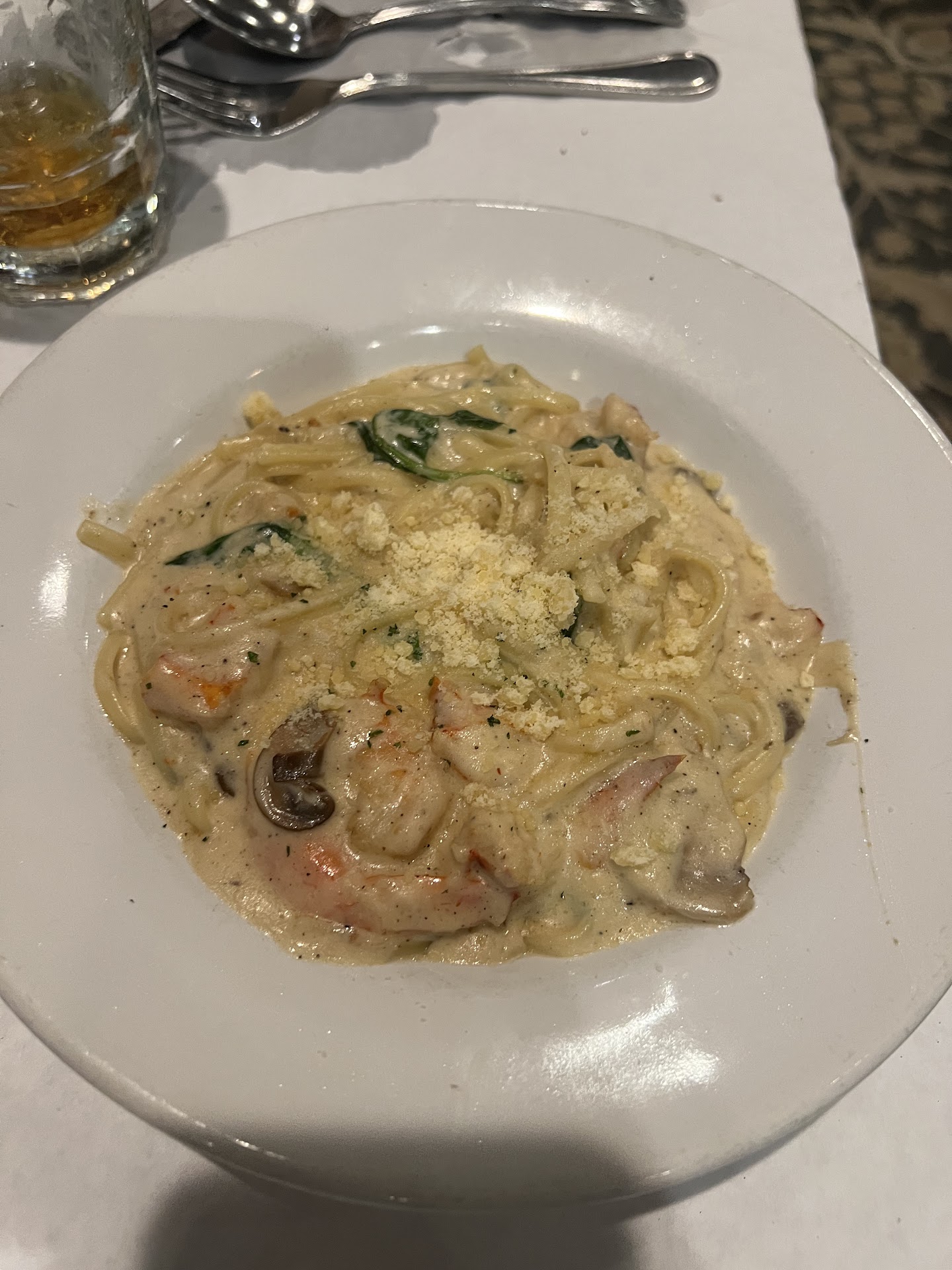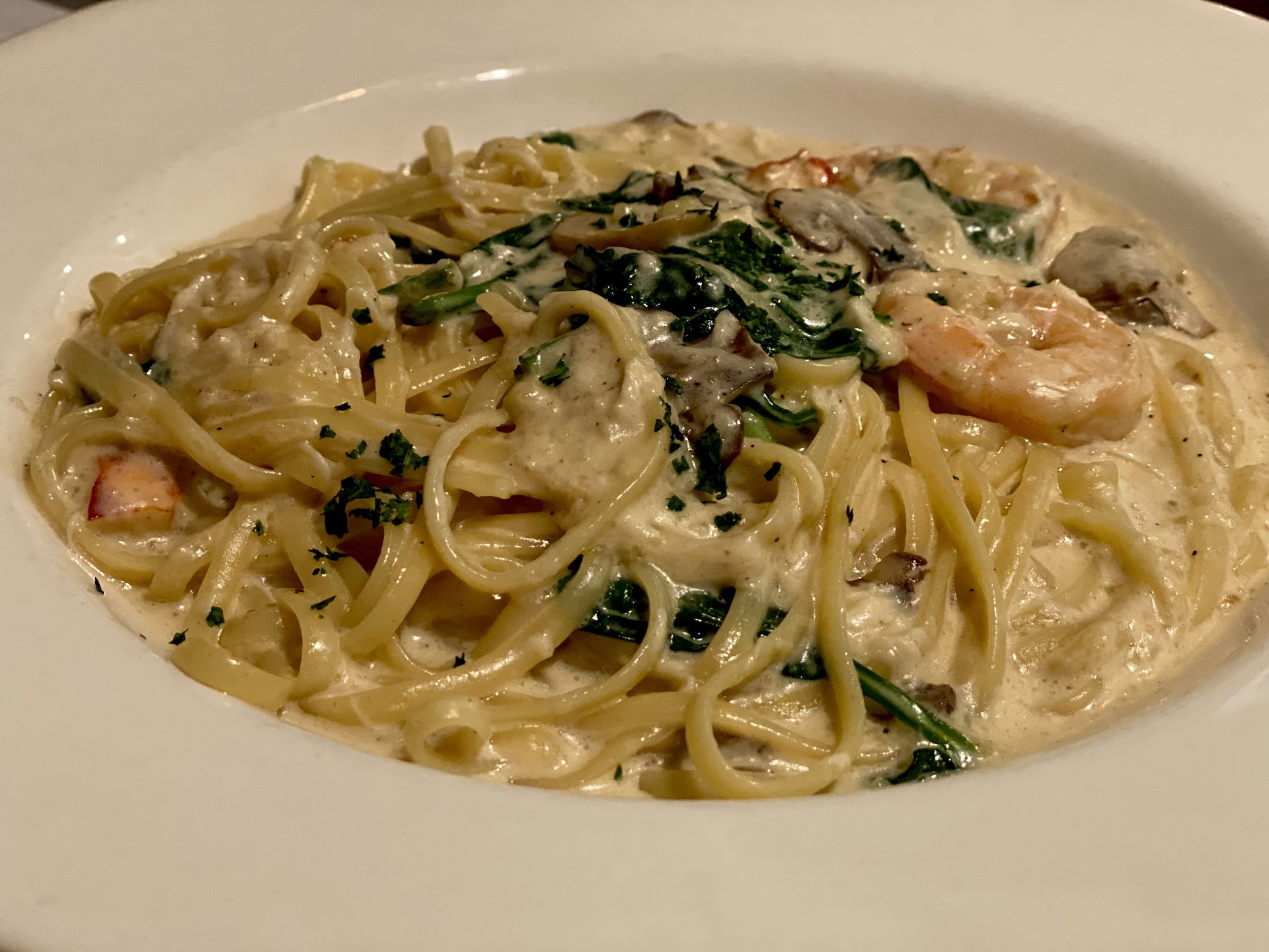 I had every intention of getting their filet tonight, but their linguine tritone caught my eye—lobster, crab, and shrimp in a cream sauce over linguine—to die for. I regret getting the full portion because the half portion would have been plenty. At least I have a midnight snack. Ha. Rogers was a good boy and ordered a small portion of their fettuccine Alfredo—that’s why he’s skinnier than me. Our entrees were outstanding.
