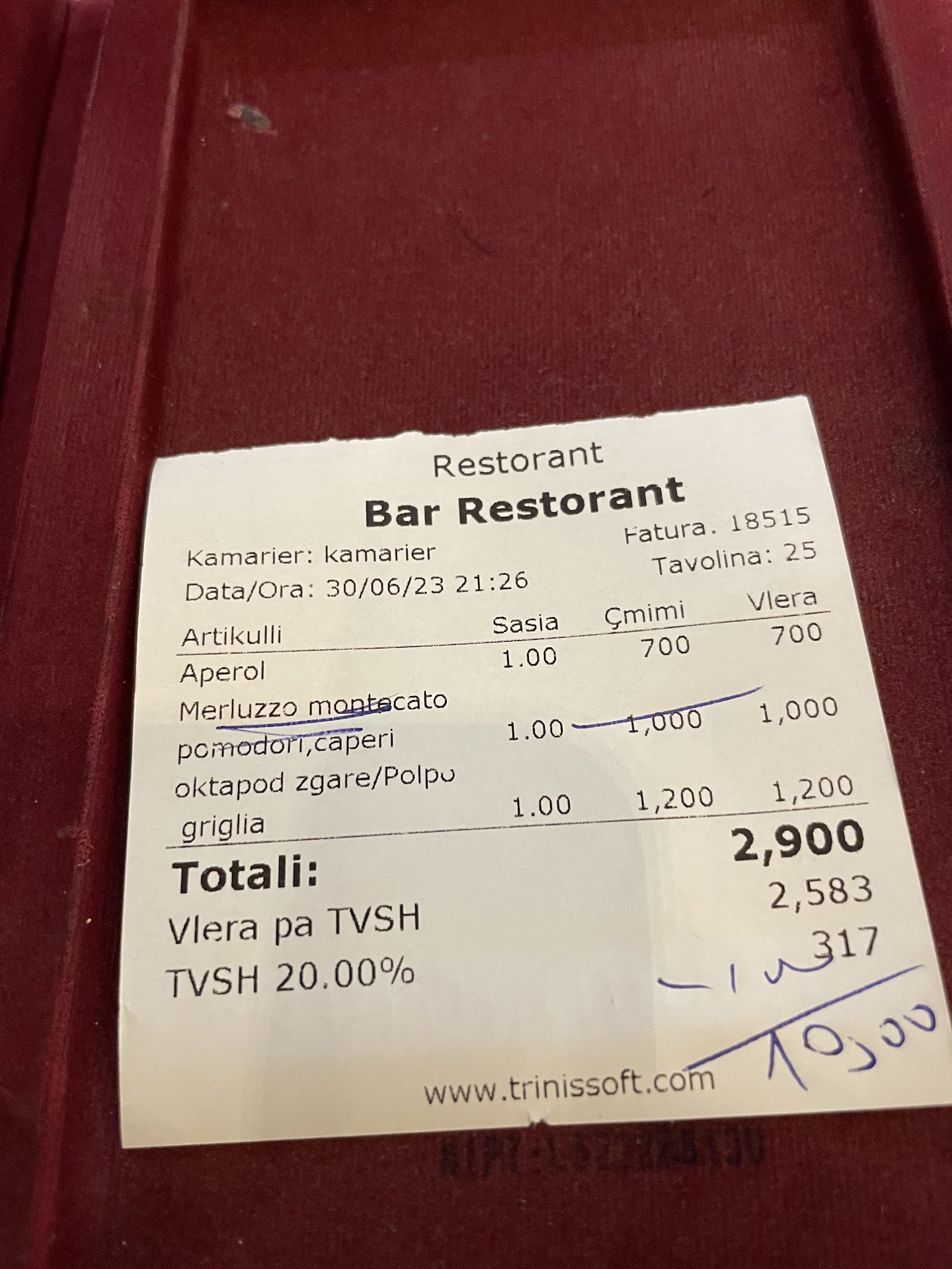 Read moreWhile the location is stylish and right by the sea, there is a lot of room for improvement. I ordered Tuna, they don’t have tuna. Ok. Then I ordered Cod and Octopus. The cod arrived, but it was actually Sepia because they didn’t have Cod, either. I did not want this, so at least they took it away without issue. The octopus arrived, presented just as the tips of the tails. Somewhat strange presentation. I wonder what happened to the rest of the octopus. Finally the octopus was undercooked, the tip of the tail did not have the charred flavor or crisp that makes grilled octopus so good. And the overall texture was chewier than it should be. When the bill arrived I was glad to see that they didn’t charge me for the plate I didn’t order, but the Aperol Spritz was 700 Lek! Even by the sea the average price for an Aperol is 400-500 Lek. It was the most expensive drink I paid for after 10 days in Albania. Hopefully in the future they can manage to make sure the dishes offered on their menu are mostly available and make improvements otherwise. It is a...