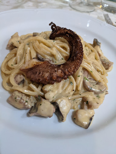 We also had exceptional appetizers, featuring squid, octopus, and a kind of sea bass arancini. Can’t emphasize enough how perfectly everything was cooked. Even my husbands pasta with his seafood carbonara was taken out of the pot at just the right time.