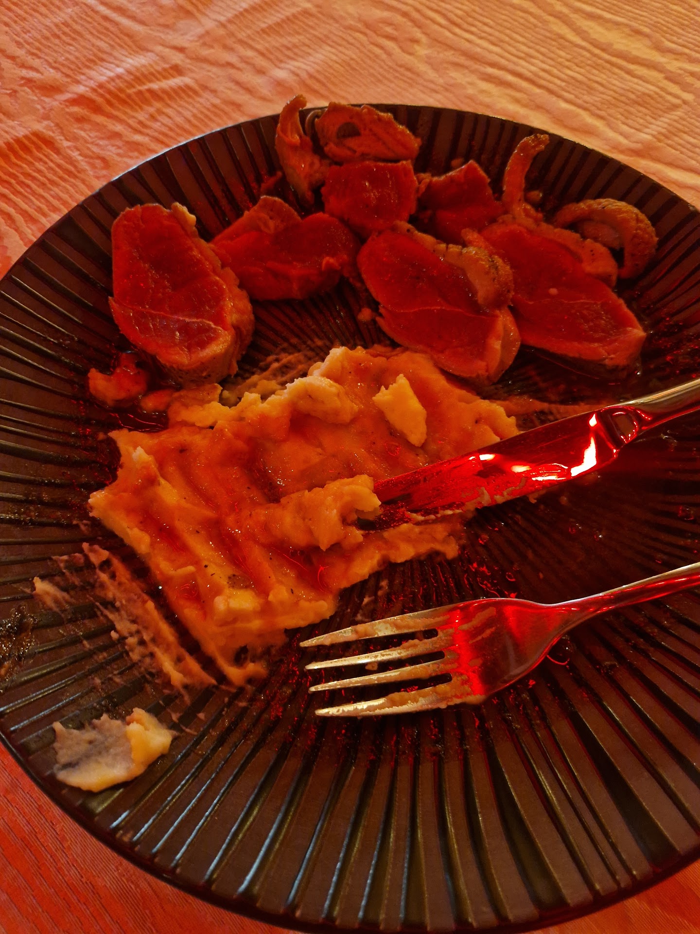 The main course was served. Nice fried potatoes, again served with ketchup and an entrecote, very tender and nice, a portion of wild duck, which was not as tender as hoped and the 2 very different types of meat was served with the exact same garnish. NOT a very good choice as beef and duck are very different types of meat.