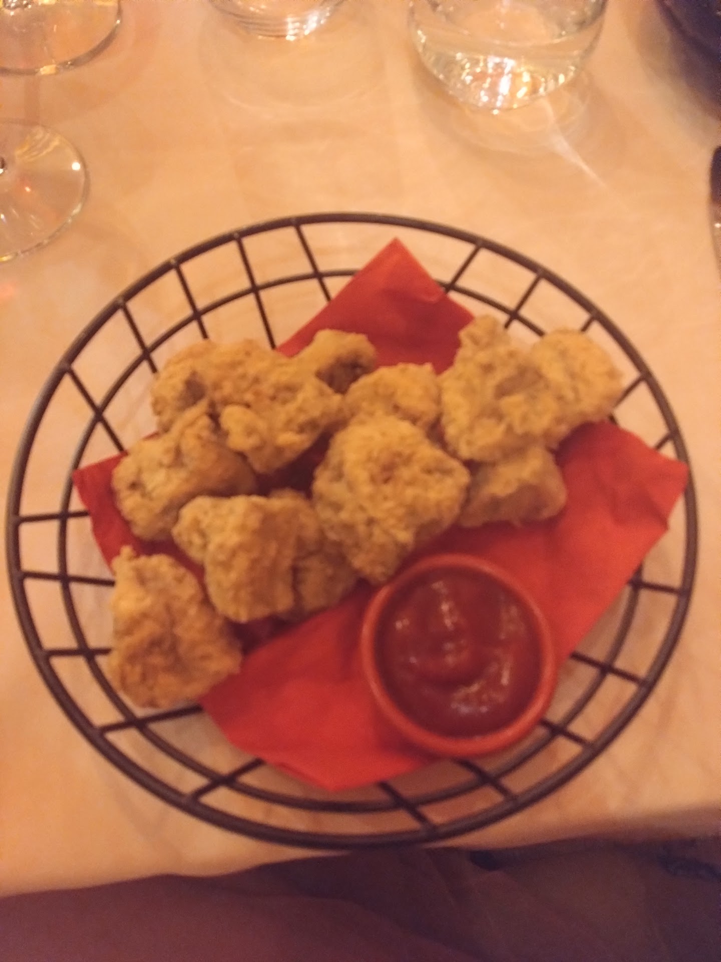Read moreWe ordered starters. Fried mushrooms 12 euro and cheese baked potatoes 8 euro. The mushrooms, didn't taste like much, but was very crispy. But they were served with KETCHUP! like a children's meal. Not good. Asked for another sauce or dip, but all they had to offer, was mustard and mayonaise. Not at all satisfying. I asked for salt and pepper 4 times, but it didn't reach the table before I only had 2 mushrooms left. We ordered wine, which was served with sublimity. And a very well produced Argentinian wine at only 20 euro. The cheesy potatoes was very nice, very cheesy.
