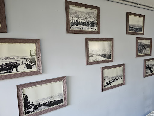 Altes Schwarz weiß Bilder hängen an der Wand innen somit sieht man wie es früher war beim Prespa See.