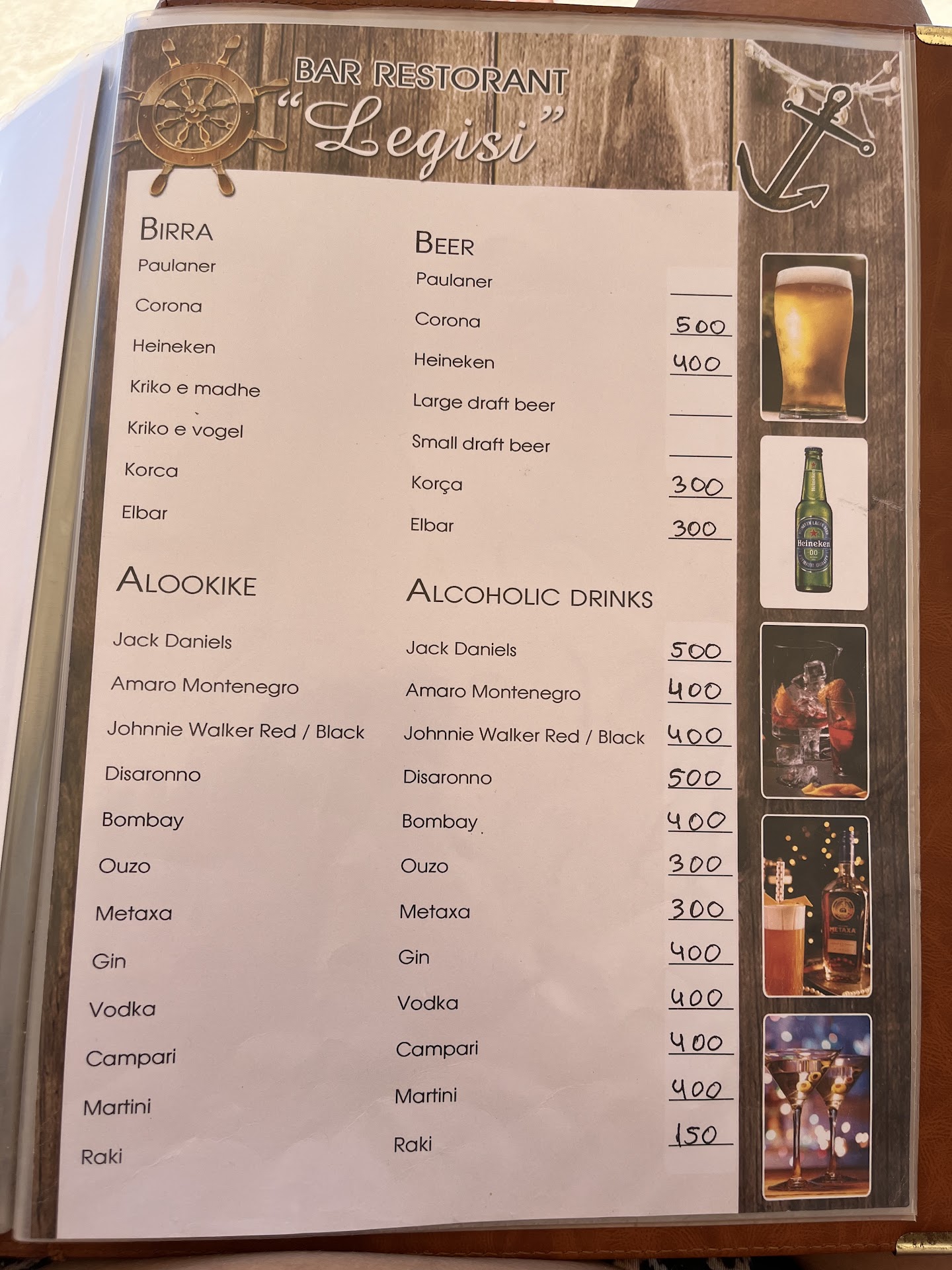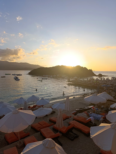 Read moreI'm late writing this review, but we went on July 7th. We hadn't actually wanted to go here, but we accidentally found a great beach. There were a few kids, but the sea was wonderful and stayed clean for hours. There wasn't any music, but it was coming from the neighboring beaches. We paid 30€ for two sun loungers and an umbrella. It's a great place to relax, and the beach is sandy, with no stones that hurt your feet. Food and drink prices were very reasonable. We rented a pedalo, but it was a bit difficult for us because of the wind; it cost 1000 lek for an hour. I've left the menu for you to check out. We ate both on the beach and inside. There's a small tap to clean your feet, but there's no shower. The only downside is that there aren't many staff members; we always have to go upstairs to order. I think you should...