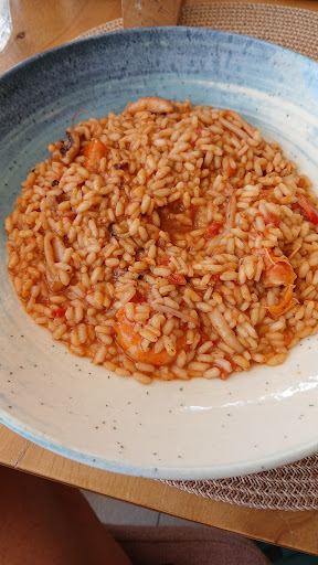 Ten minutes later, a large group of Italian retirees stormed into the restaurant, displaying an arrogance and conceit that was hard to believe. The waiter came to take our order, clearly stressed by the group's sudden arrival, and then left. While we waited for 50 minutes (!) for our food, we watched as the retiree group, who arrived 10 minutes after us, was served one dish after another. We were seated in a terrace area, which was marked as a smoking section. Despite the unprofessional service, we remained understanding and signaled to the friendly waiter in the shirt not to worry or rush. To pass the time, we smoked cigarettes with our drinks.
