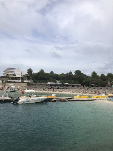 The sea is quite shallow and sandy here so you can come with small children. Umbrella with deck chairs cost 1000 lek (it is August 2019). You can buy here little Albanian donuts for 100 lek. The entry to water playground can be bought from the guy at a cement pier under red umbrella (there is no information anywhere). It costs 1000 lek per person and I'm not quite sure for how long it is, because at a first day we were said that it is for an hour but no one leaves until has enough (our children spent there 3 hours and 2 hours next day). You can also rent a pedal boat - prices vary (you can haggle) - we paid 3000 lek for 3 hours but it is possible to pay 4000 for whole day. One hour costs 1200 lek or 10 Euros. What I don't like about here is that smoking is permitted so the chances are that you will be...