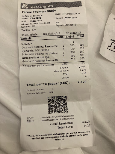 We cannot recommend Era Vila highly enough. It is a place not to miss if you are ever in Tirana. If we could rate it 11 out of 10 we would. You will not be disappointed. I can honestly say it was one of the best meals...