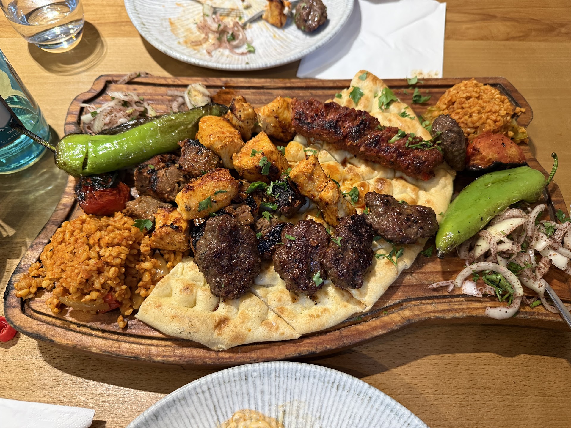 The mixed grill was delivered to the table within reasonable time. The portion size was generous and the food was delicious. It had a mix of Chicken shish, lamb shish, Adana kebab, along with bread and rice.