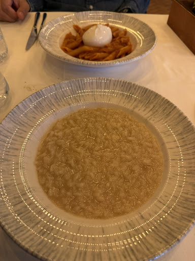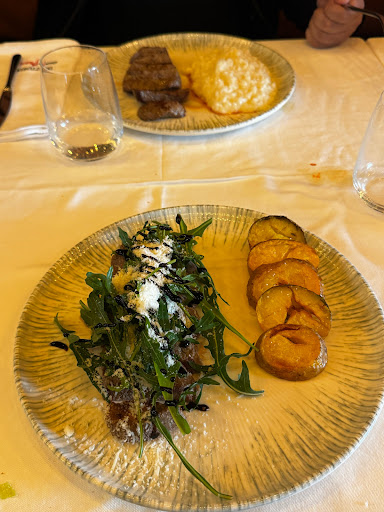 El salón tiene una decoración contemporánea muy cuidada, con buena iluminación y un ambiente relajante. La carta es variada, aunque curiosamente no incluye pizzas, algo poco habitual en una trattoria. Nosotros pedimos una ensalada César, un plato tradicional con carne y quesos locales, unos macarrones con burrata y un risotto al azafrán con parmesano, y todo estaba delicioso, con una presentación muy cuidada y sabores auténticos.