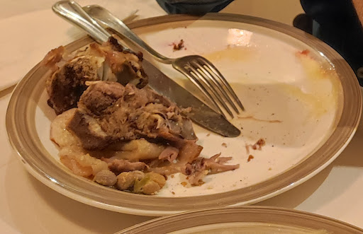 This is an extraordinary restaurant that serves very traditional Albanian food in a Homestyle way. It has NO menu but the two sisters that run it know what they are doing! They approach each table and ask what you might like or want and will set a four or five course meal for you, if you want meat, they’ll let you know what is available. Of course we choose lamb. Our first course was a hot flaky onion Lakror which was delicious followed by wonderful Greek salad with feta, cucumbers and the most sweetest tomatos with pitted olives. Then came an incredible leek baked with a light pepper tomato sauce which was unlike anything we’ve ever had feed before. The flavor was so unique and delicious and the leeks were lightly carmelized. It was very hot and came with an oven mitt. Alongside this was a homemade bread with a tremendous crust yet the center was so soft. We naturally assumed that the leeks were the star of the meal but then came the lamb shank in a very light broth which we then pulled the tender bits of lamb and dipped it into the broth and realized that this was perfection and could not get any better anywhere!! The final touch was a piece of almond coconut cake along worth grapes and watermelon. The best way to conceptualize the experience is akin to a fixed price 5 course meal as imagined by the chef.