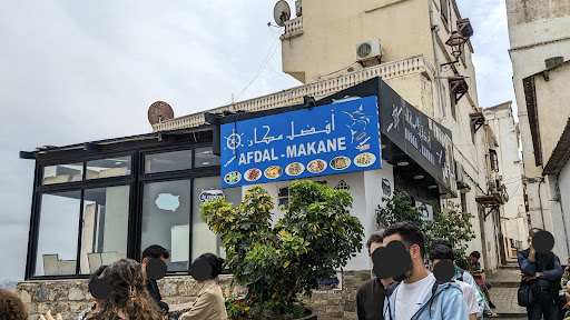 Whenever you talk about visiting the casbah, this is one of the first places you get recommended to go to when there. First of all you need to walk a lot to get there, or you can also go with your car and park not too far. The place itself is quite small with only a few tables, so prepare to sit with other people at the same table when need be. I don't know if the timing was wrong, but a long queue was formed in a short time when I went, so of course we couldn't eat slowly while a bunch of people kept waiting (The half eaten food in the picture is proof since we were hungry and eager to finish). The view, which is endlessly raved about was nice but nothing extraordinary, and you can't even see it when you're seated. Coming to the food itself, it was again good but nothing impressive, while the prices were a bit expensive compared to other places. I recommend ordering different things if you're with others to taste more food. The menue is offered and you get to choose between salads, soups, fries, and seafood. The service was okay.