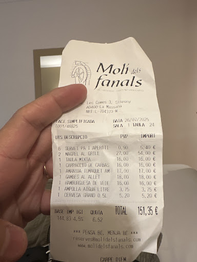 Wir waren am 26.07.2025 mittags im Molí dels Fanals essen – und haben über 150 € für zwei Hauptgerichte, einige Vorspeisen, Wasser und ein Bier bezahlt. Was wir bekommen haben, war schlicht eine Frechheit: