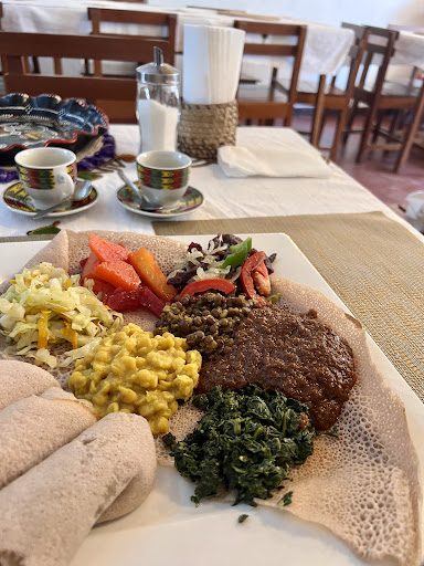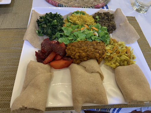 Eating Ethiopian food the traditional way means eating with your hands. Injera is the name of the delightful sour and spongy pancake-like bread that’s practically synonymous with Ethiopian cuisine. Made from teff flour, a grain grown in East Africa for millennia, it is vegan and gluten-free, explained Mike. The injera is used to scoop the various food piles into your...