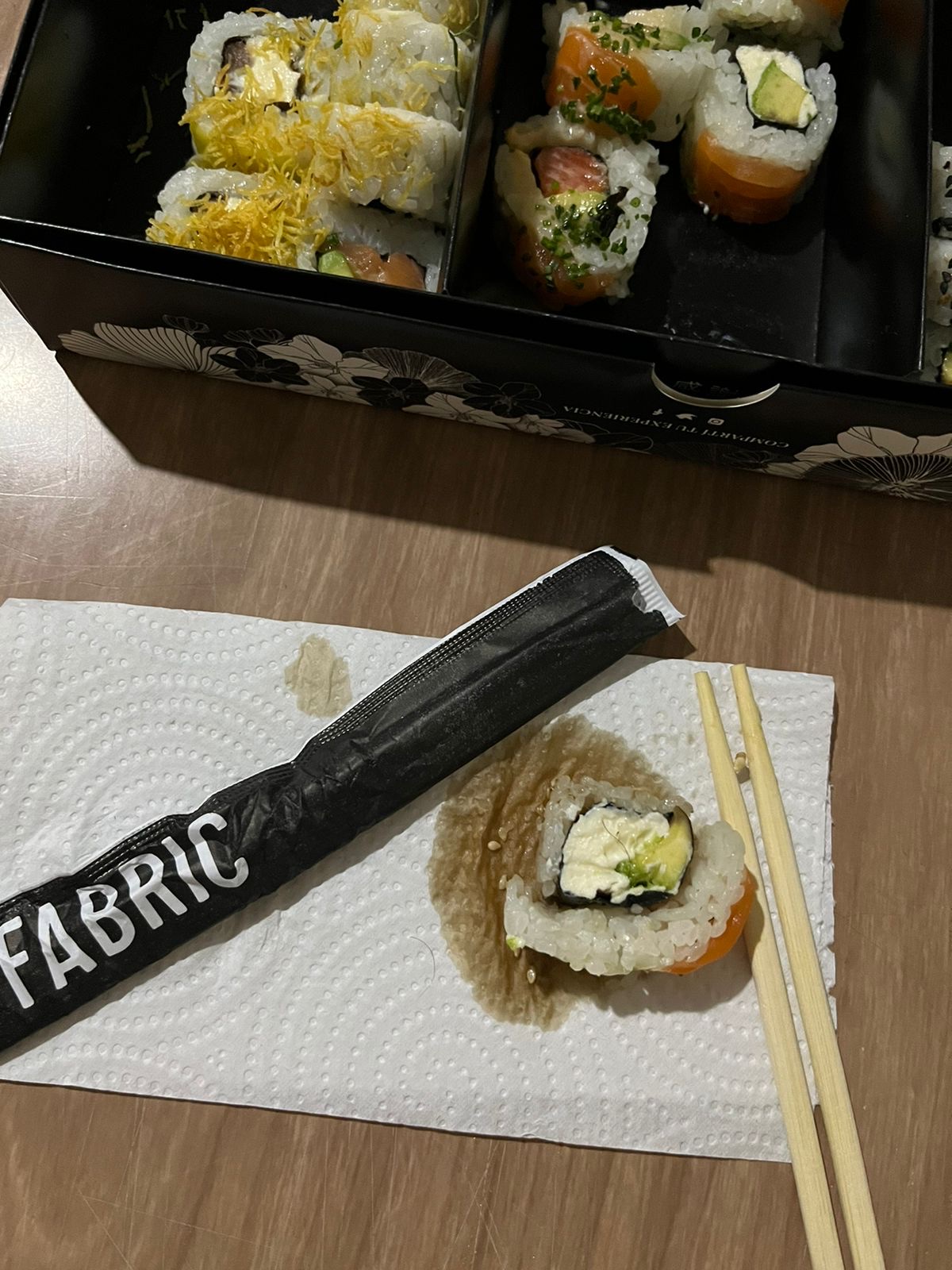 Read moreLa higiene del lugar deja mucho que desear. Mesas sucias, sillas rotas y sucias. Me pusieron en la mesa una tabla de madera laqueada toda gastada sobre donde se suponía que debía comer. Totalmente insalubre comer sobre madera algo como pescado crudo, ni hablemos de hacerlo sobre algo tan toxico como una laca que se esta descascarando, sumado a que el cacho de madera por q no podría considerarlo un plato tenia granos de arroz secos, se ve que no los limpian muy bien. El recipiente donde se pone la salsa de soja era de vidrio y estaba quebrado en las 4 esquinas.