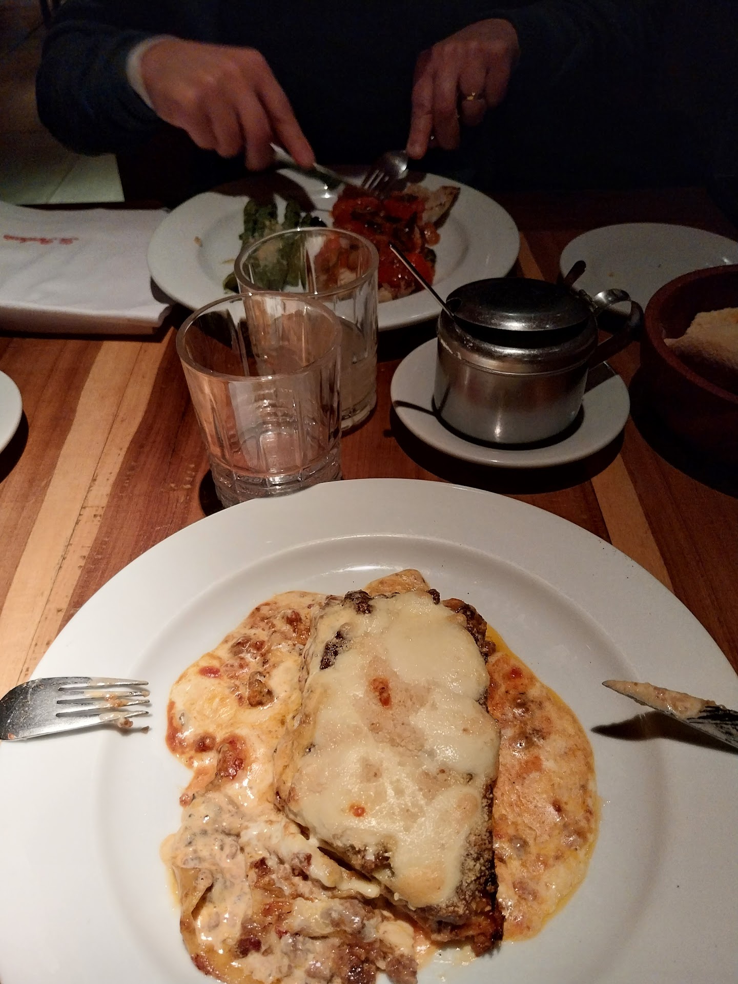 Read moreNos recomendaron este lugar para ir a comer lasagña, y nos recomendaron el menú Parolacho que consta de aperitivo, bebida, entrada, plato principal, postre y café con petit four, (todo por 42.000$ x persona hay 4 ó 5 opciones de cada paso, podes elegir 1 solo plato. Elegimos rabas con zuquini frito. La raba impecable el zuquini más crocante de lo común a mi gusto. Milanesa de berenjena: chiquita pero exquisita. Lasagña: modesta porción, eso si, abundante queso y solo algo de carne entre pasta y pasta. Abadejo: rico, la salsa muy fresca con cherrys, los esparragos muy fibrosos... Este menú llamado Parolacho no nos lo ofrececieron. Cuando llegamos a la mesa, nos trajeron la carta de platos y la de vinos. Recien cuando le preguntamos por el menú Parolacho, retiraron las cartas "grandes" y trajeron la mini carta con dicho menú. Si bien es un menú económico "ponele", me hubiera gustado que la carta de este menú no este aparte en otro porta menú mucho más pequeño y con lamparones de aceite. Como veran en la fotos así se sirve, la porción es modesta. El café riquisimo, pero los merenguitos unidos con dulce de leche, las cáscaras azúcaradas y los mini brownies... si a eso le llamamos "petit four" la verdad es que me imaginaba otra cosa. En fin... lo que más me gusto fue el postre pero el cuarto de frutilla me dió tristeza, ponele media frutilla por lo menos, me dio vergüenza decirle al que pasaba a preguntarnos qué tal todo... Quizás vuelva en otra oportunidad a probar algo de la "carta grande" en la cual te cobran el servicio de cubiertos 3.800$ (en el otro menú ya estaba incluído). Gracias...