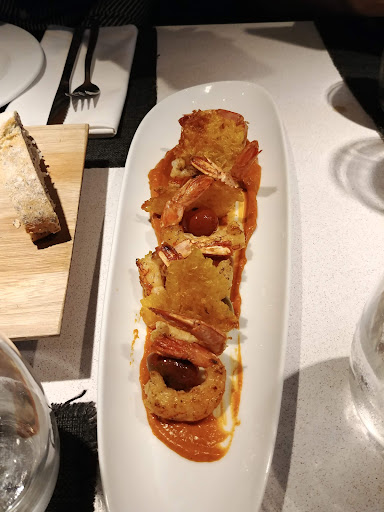 The restaurant had a dark, intimate vibe that felt both serene and elegant, perfect for a relaxed evening. There was a small chip in my water glass, but it was easy to overlook in such a thoughtfully designed space. The service was great. They were attentive without being pushy, and the timing was just right, giving us enough space to enjoy each course without feeling rushed. We wanted to try the cocktail of the day, expecting something unique, but the options were just a gin and tonic or an Aperol Spritz—nothing special. We chose the gin and tonic, but it was way too strong and lacked the refreshing citrus kick we were hoping for. The cocktail felt like a missed chance for something more creative and interesting.