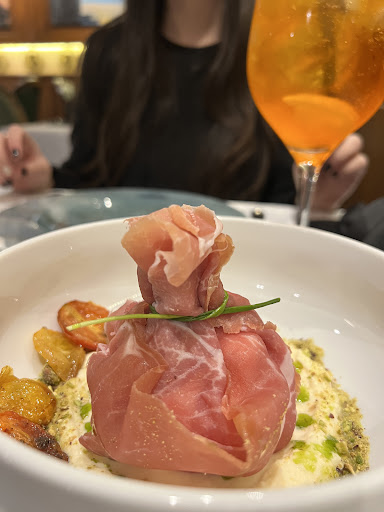 De entrada pedimos la burrata con jamón crudo. La presentación estaba muy bien lograda, lo que nos resultó raro fue la burrata, no era fea, pero la textura era similar a la de un bocconccino. El jamón crudo, calidad normal, podrían mejorar.