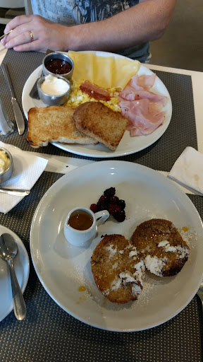 Fuimos a comer un brunch, pedimos dos desayunos/merienda del menu. Trajeron todo a destiempo, el cafe primero con dos medialunas de un menu, despues trajeron las tostadas y los huevos revueltos que decia con panceta que era literal una fetita de 5 cm de largo, los jugos exprimidos los trajeron cuando ya habiamos casi terminado de comer, las camareras trataban ponerle la mejor onda posible y como mi marido termino su cafe antes de que le trajeran la comida le ofrecio otro sin cargo como compensacion. Igualmente me parecio cualquier que cobraran servicio de mesa cuando no nos trajeron ni panera/agua, ni nada que lo amerite. Las tostadas francesas no eran feas, pero el pan adentro estaba muy seco como si no lo hubiera remojado correctamente y eran dos panes bastante pequeños para lo que sale la porcion. No volveria.
