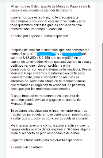 Le dijimos al cajero que hable con MP para solucionar el problema y el habla con un encargado llamado Martín, el que lo único que hace es dar la misma respuesta aún cuando nosotros le brindamos toda la información como nro de transacción y demás para cotejar los datos con el centro de ayuda de Mercado Pago.